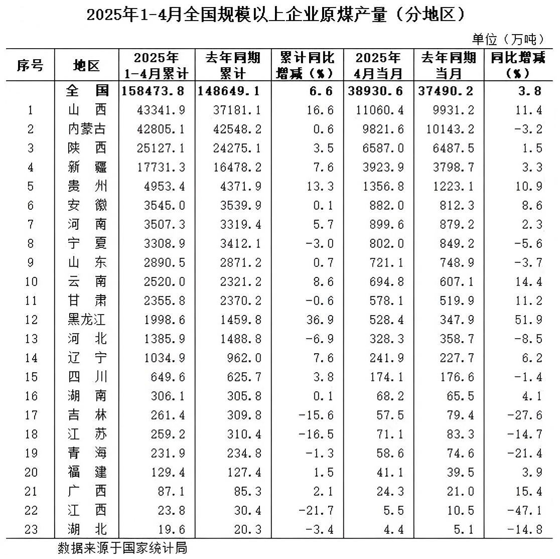 2025年1-4月份全国规模以上分省区原煤产量数据发布2025-05-24