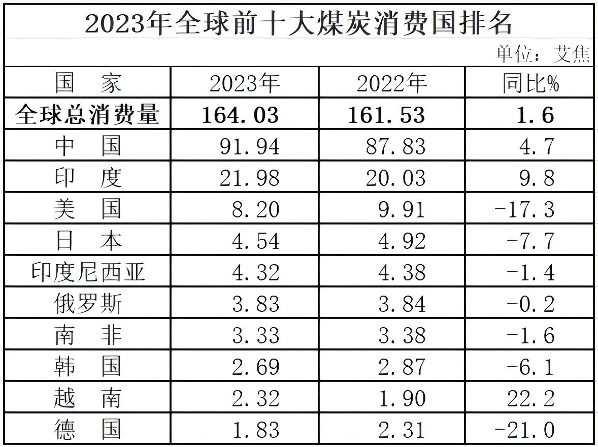 2023年,中国煤炭消费量为91.94艾焦(EJ),同比增长4.7%,占全球总消费量的56.0%。消费量排名前十的国家分别为:中国、印度、美国、日本、印度尼西亚、俄罗斯、南非、韩国、越南和德国。其中,中国、印度和越南煤炭消费量较上年有所增加。