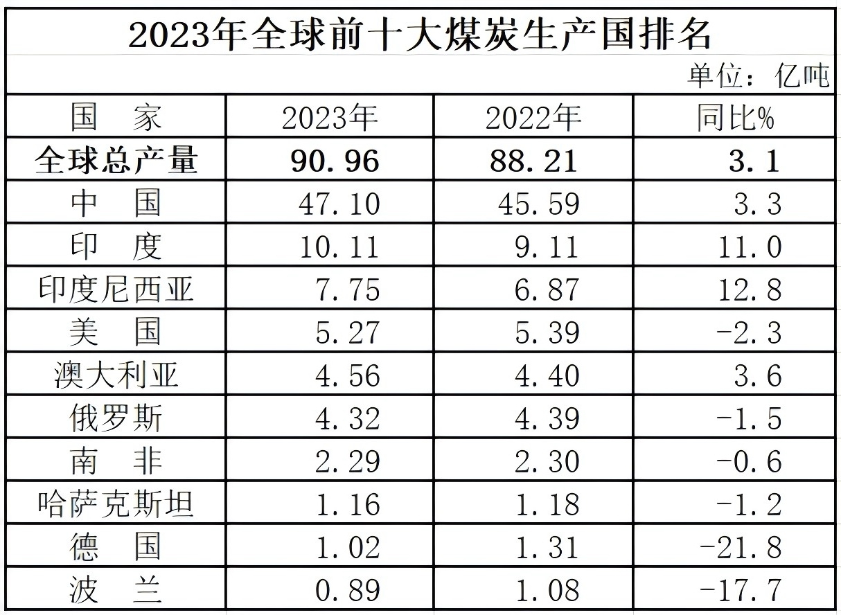 2023年,中国煤炭产量47.1亿吨,同比增长3.3%,占全球总产量的51.8%。煤炭产量亿吨以上的国家分别为:中国、印度、印度尼西亚、美国、澳大利亚、俄罗斯、南非、哈萨克斯坦、德国。其中,中国、印度、印度尼西亚和澳大利亚煤炭产量较上年有所增加。